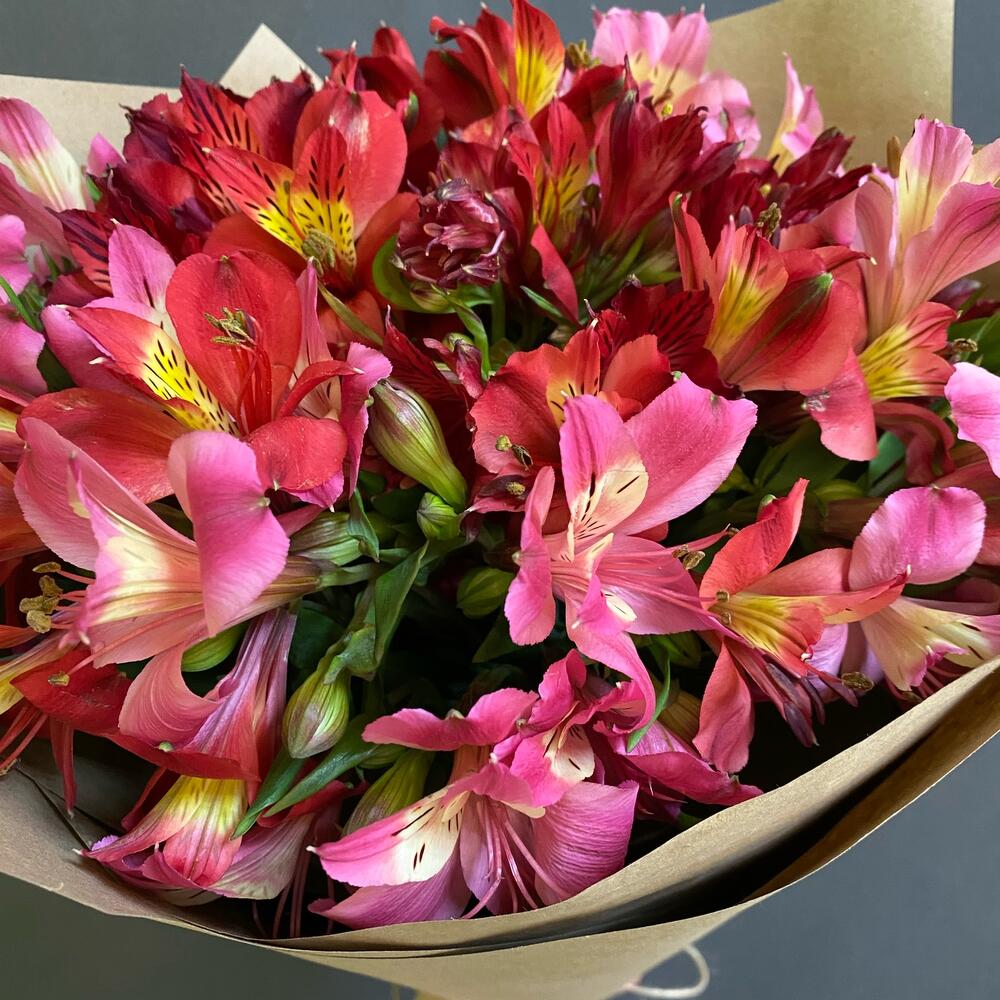 Лента атласная – 1 шт.Крафт упаковка – 2 шт.Альстромерия Микс Европа – 11 шт.
