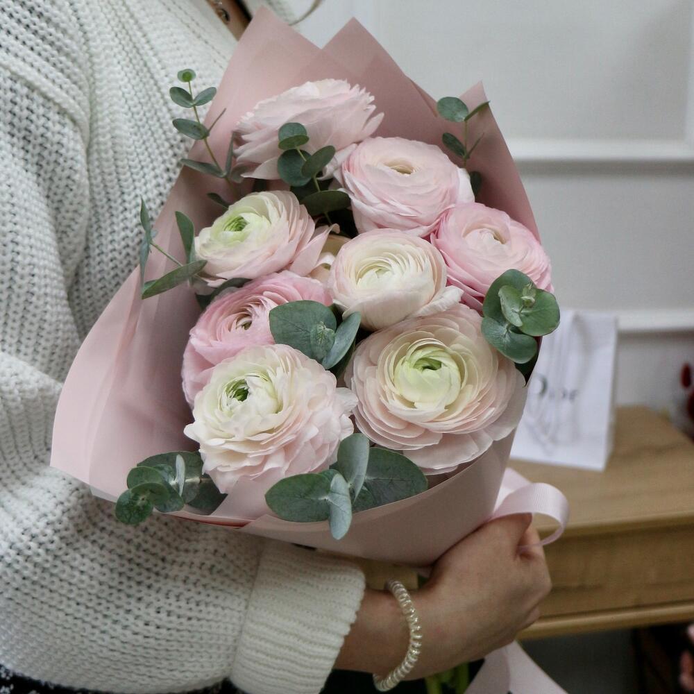 Букет розовых ранункулюсов и эвкалипта -