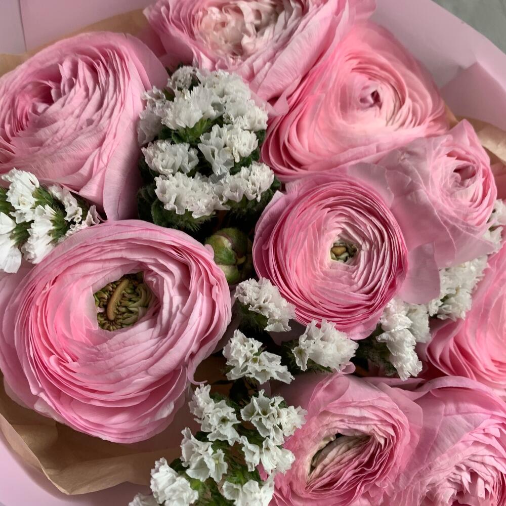 Лента – 1 шт.Статица – 2 шт.Упаковка – 2 шт.Ранункулюс – 9 шт.