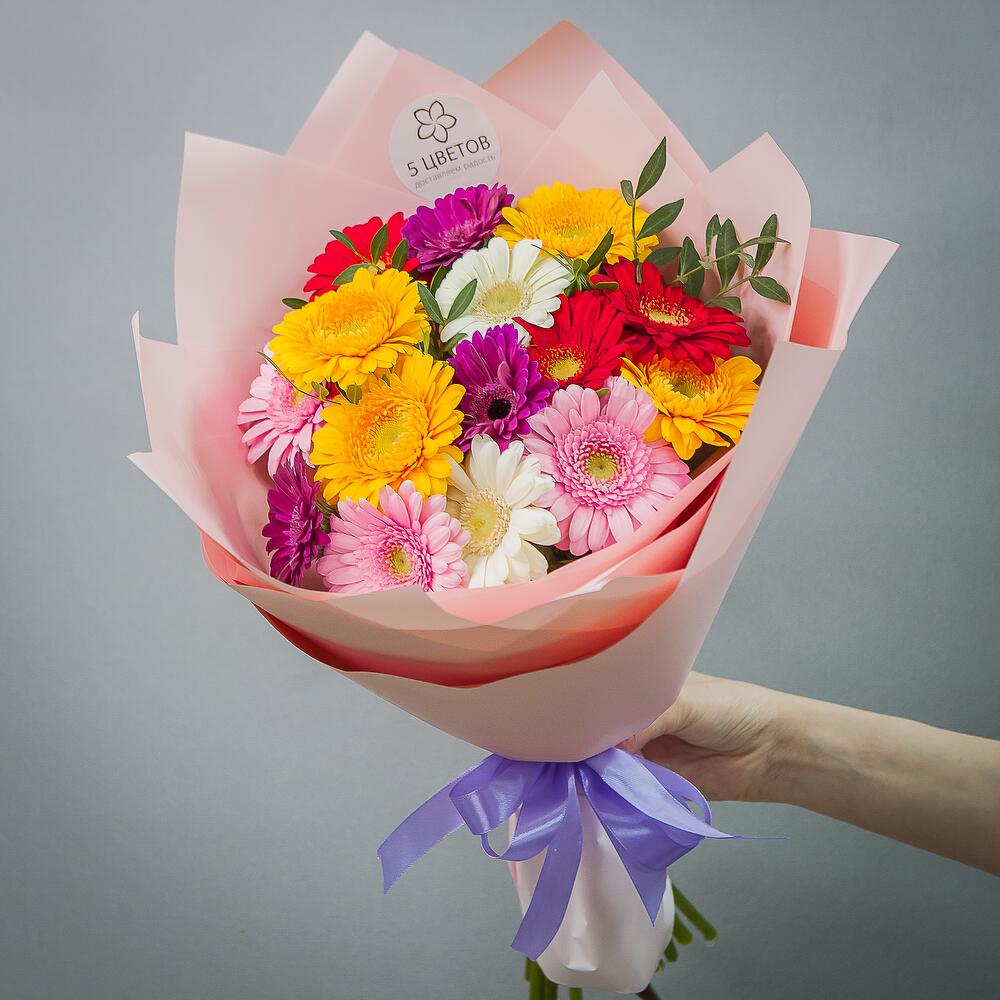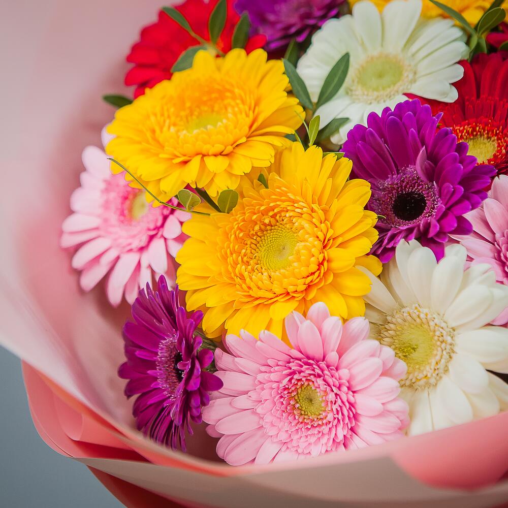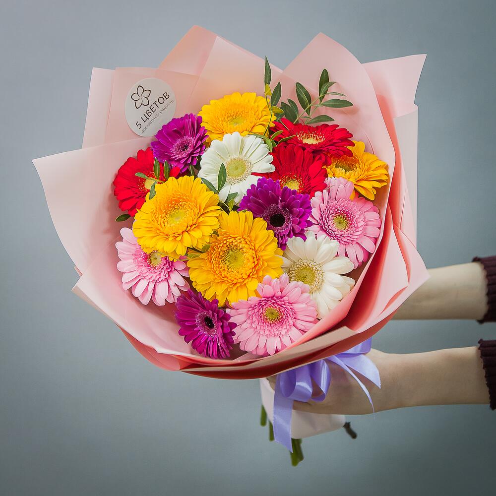 Гербера белая – 3 шт.Гербера желтая – 3 шт.Гербера розовая – 5 шт.Гербера красная – 4 шт.