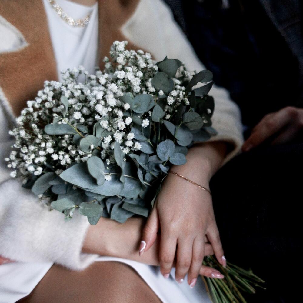 Букет невесты из гипсофилы и эвкалипта