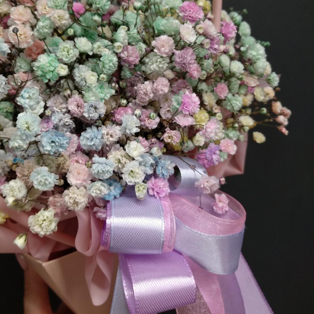 Сумочка – 1 шт.Оазис флористический – 1 шт.гипсофила радужная голландская – 5 шт.Лента атласная – 2 шт.Пленка матовая – 1 шт.