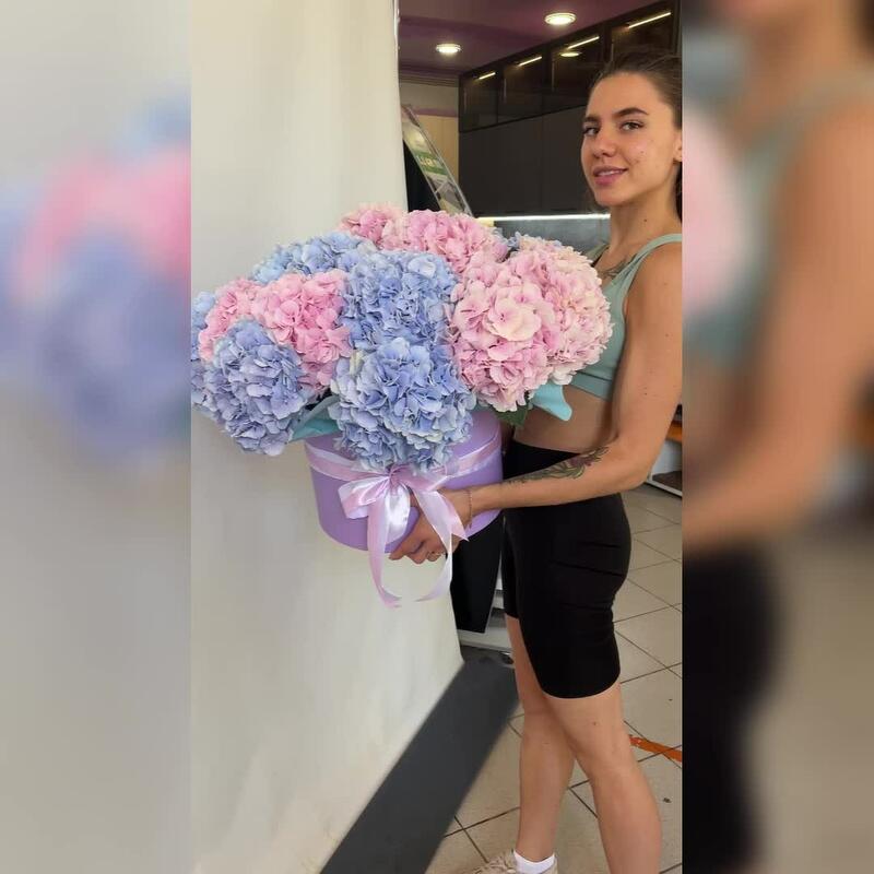 Гортензия – 21 шт.Лента атласная – 2 шт.Коробка шляпная – 1 шт.Оазис флористический – 6 шт.