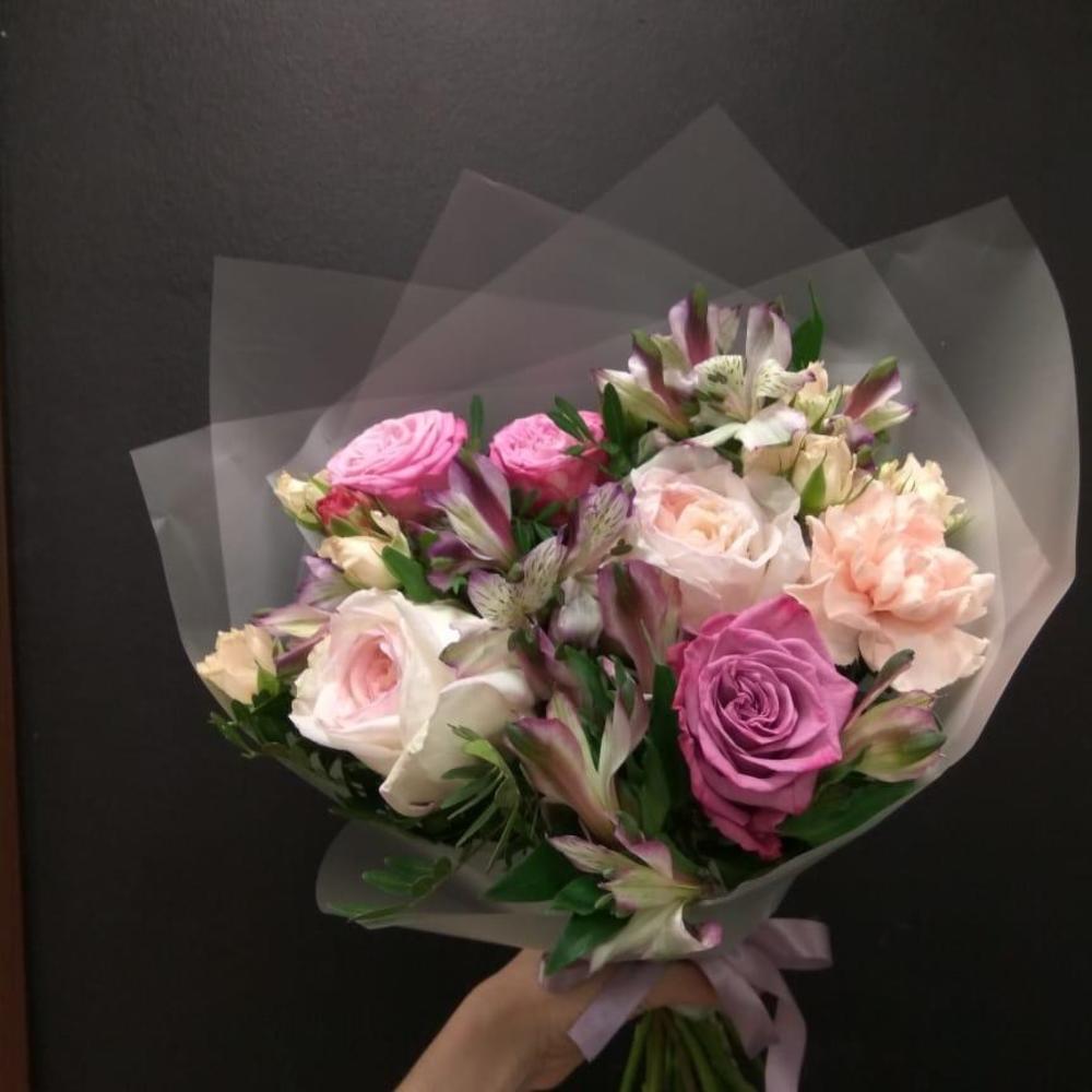 Альстромерия – 4 шт.Роза одноголовая – 3 шт.Гвоздика – 1 шт.Лента атласная – 1 шт.Роза одноголовая пионовидная – 2 шт.Пленка корейская – 1 шт.кустовая роза кения – 2 шт.