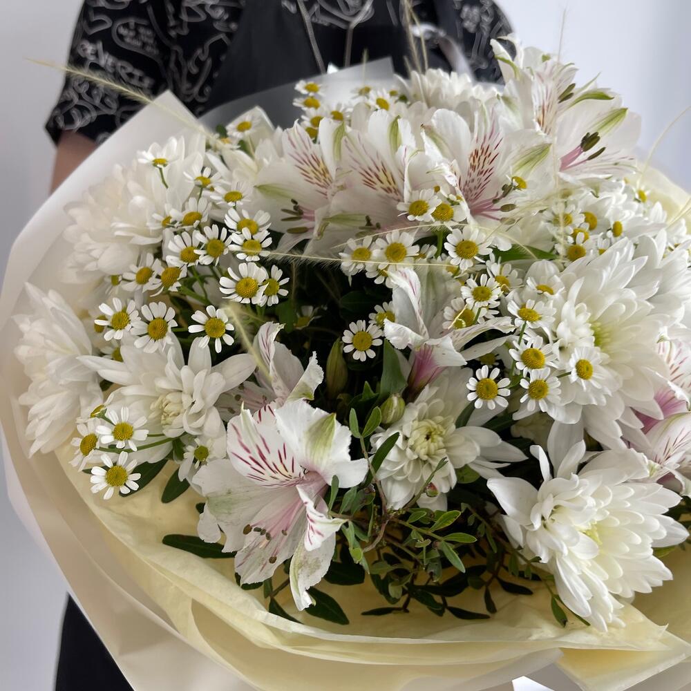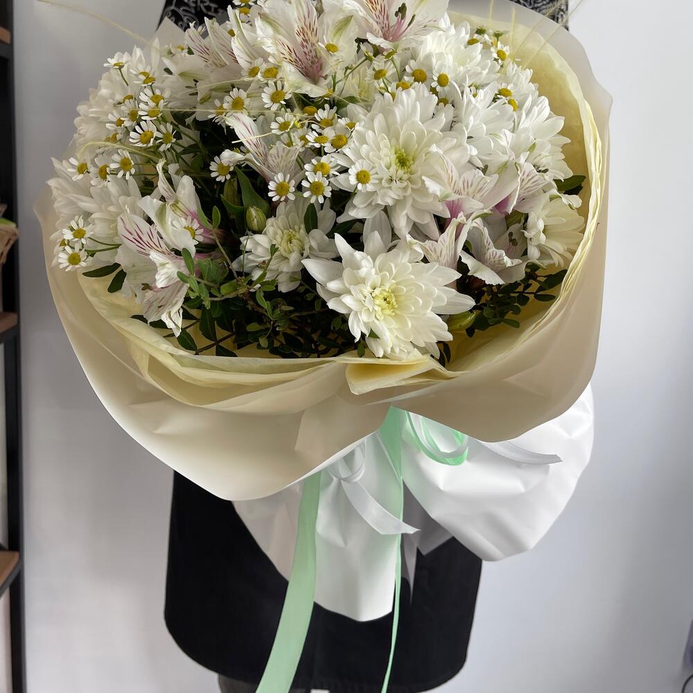 Альстромерия – 3 шт.Хризантема кустовая – 3 шт.Ромашка – 5 шт.Пленка – 2 шт.фисиашка – 2 шт.