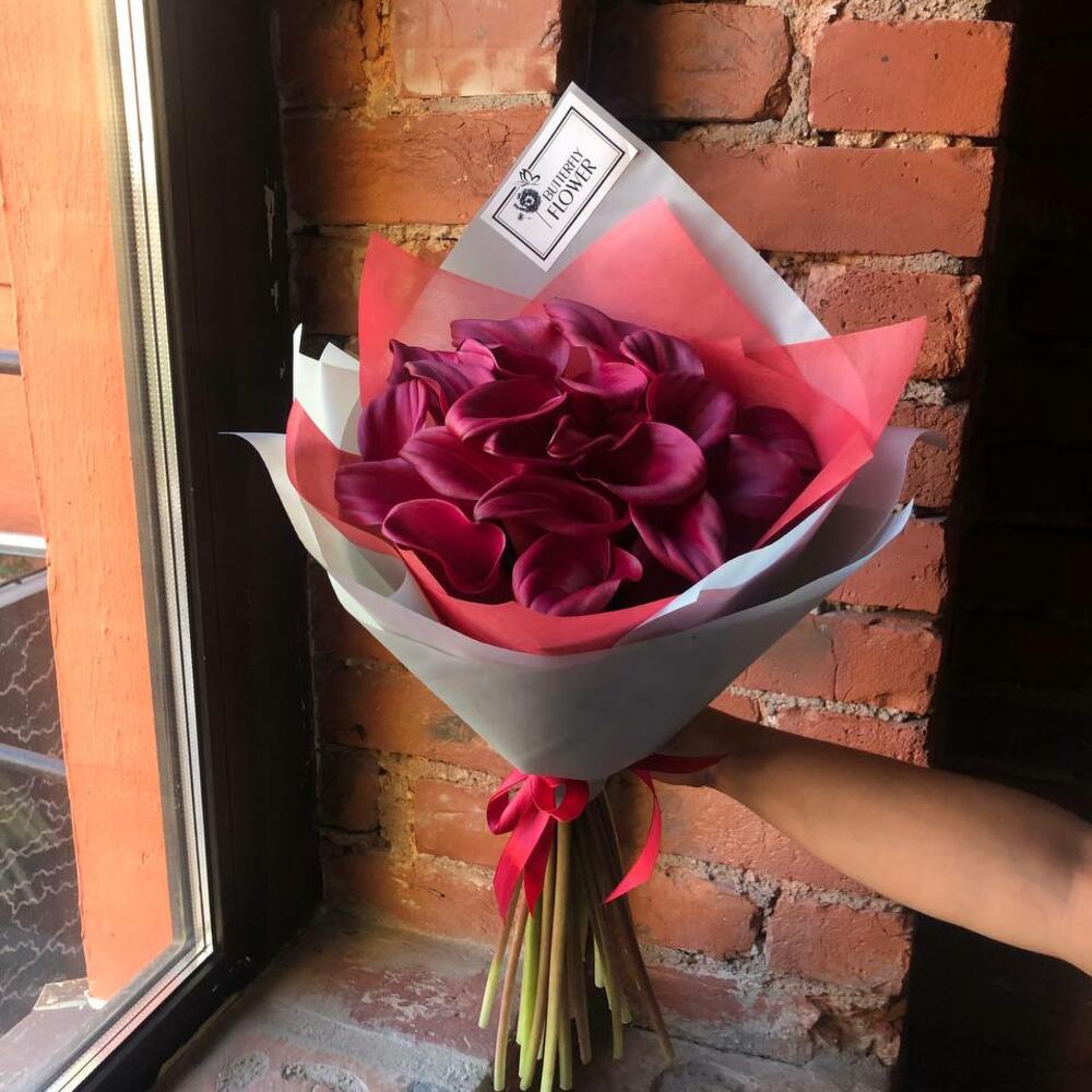Букет из 21 бордовой каллы в стильной упаковке “Минна”