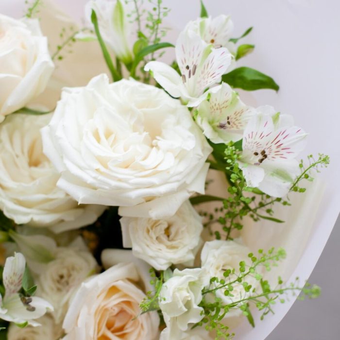 Альстромерия – 2 шт.Роза кустовая – 1 шт.Роза пионовидная – 5 шт.Гринбелл – 1 шт.Упаковка дизайнерская – 1 шт.