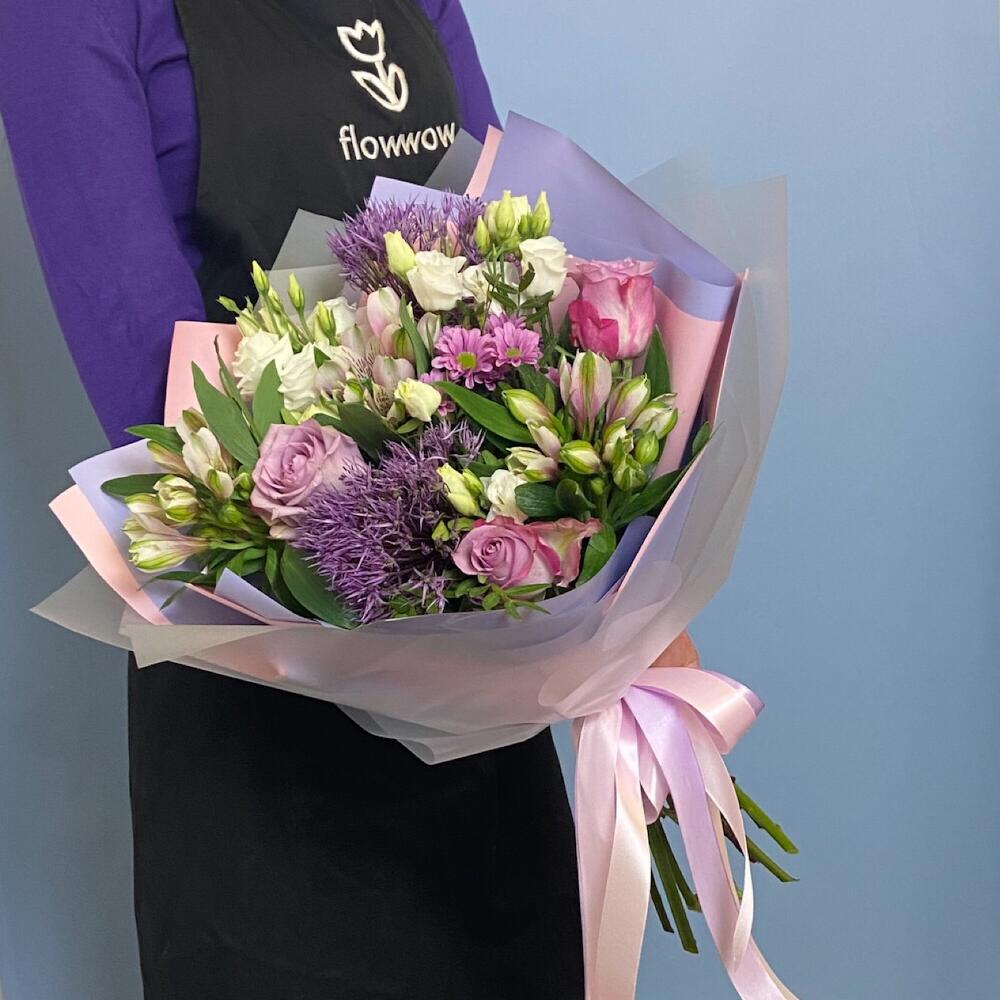 Букет с сиреневыми розами и аллиумом