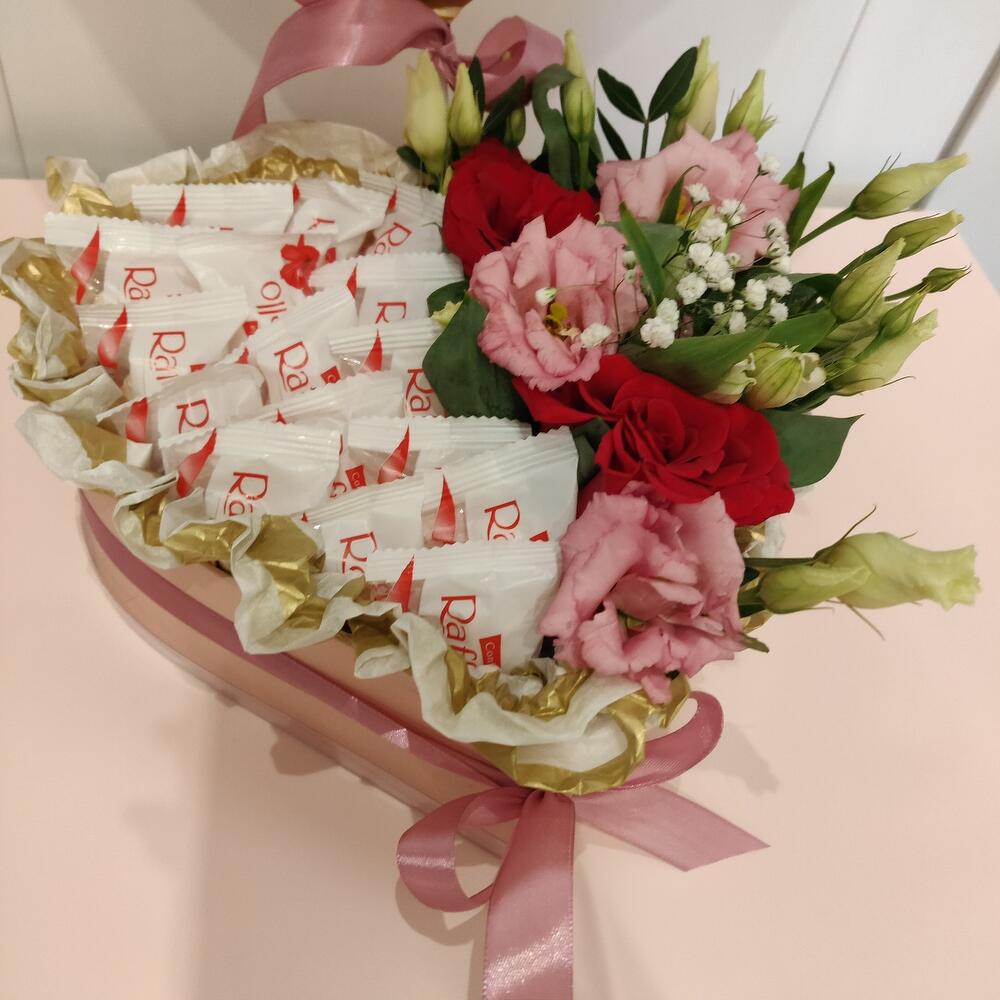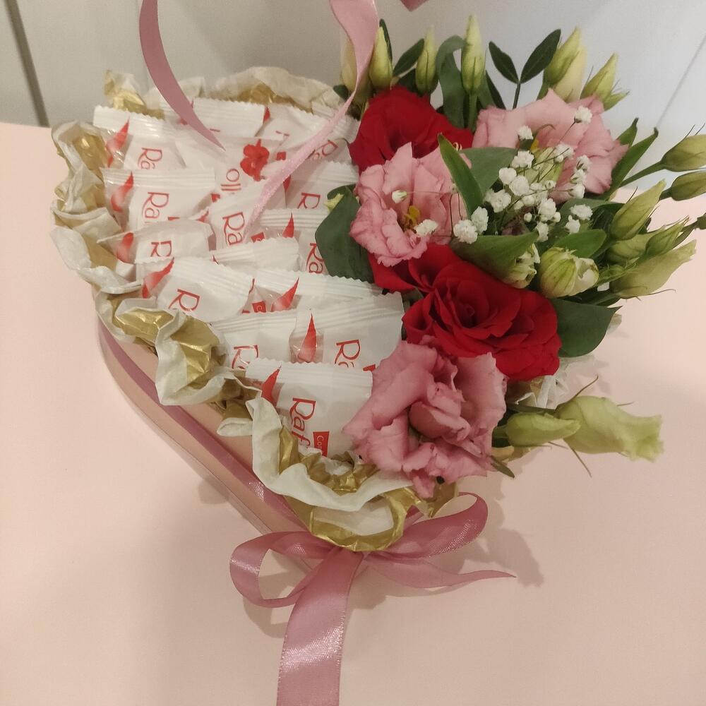 Альстромерия – 1 шт.Гипсофила – 1 шт.Лизиантус – 3 шт.Раффаэлло – 250 гр.Коробка сердце – 1 шт.розы красные 50 см – 2 шт.