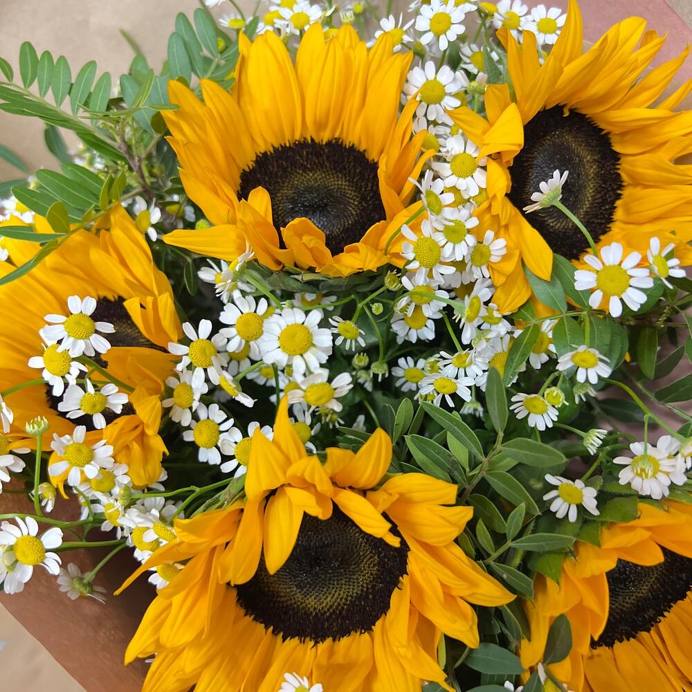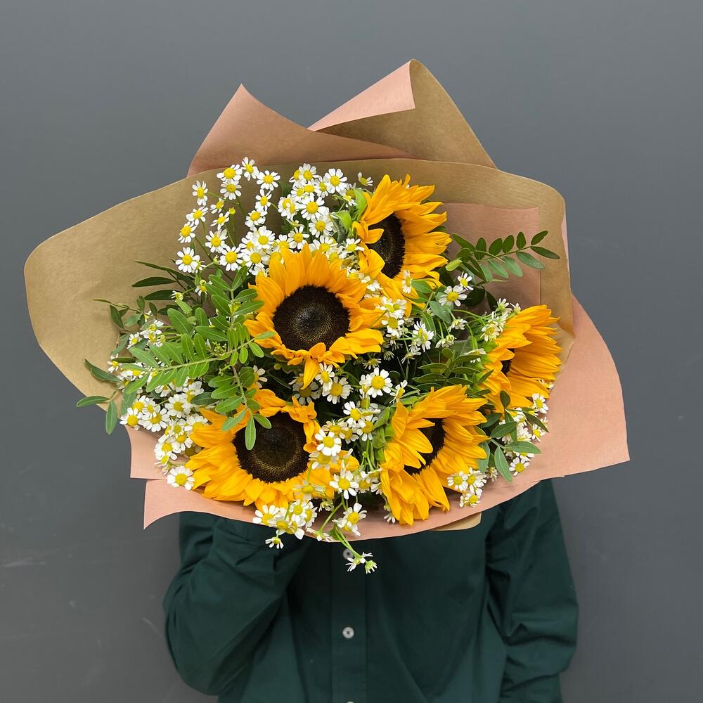 АНАСТАСИЯ солнечный букет из подсолнухов и ромашек