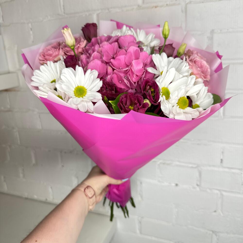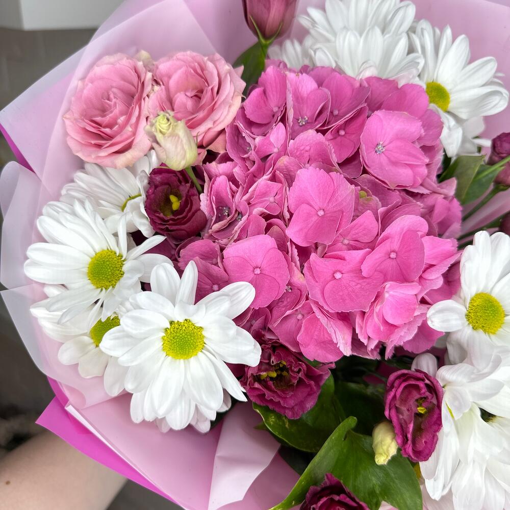 Гортензия – 1 шт.Хризантема кустовая – 3 шт.Лизиантус – 3 шт.Роза кустовая – 2 шт.Фисташка – 3 шт.Корейская упаковка – 3 шт.