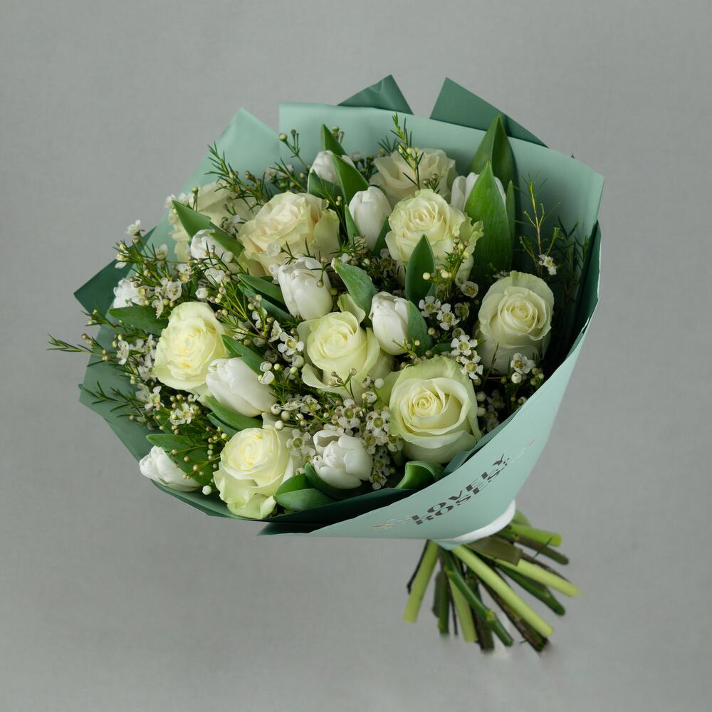 Альстромерии, Кустовые розы, Лизиантусы, Пионовидные розы, Розы, Ромашки