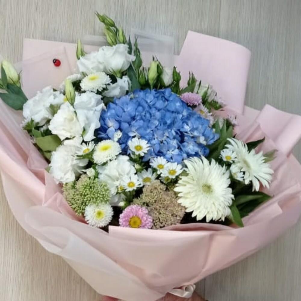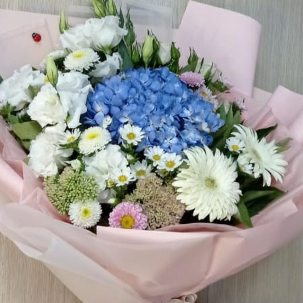 Гортензия голубая – 1 шт. Лизиантус Алиса белый – 3 шт. Гербера белая – 2 шт. Роза кустовая – 2 шт.