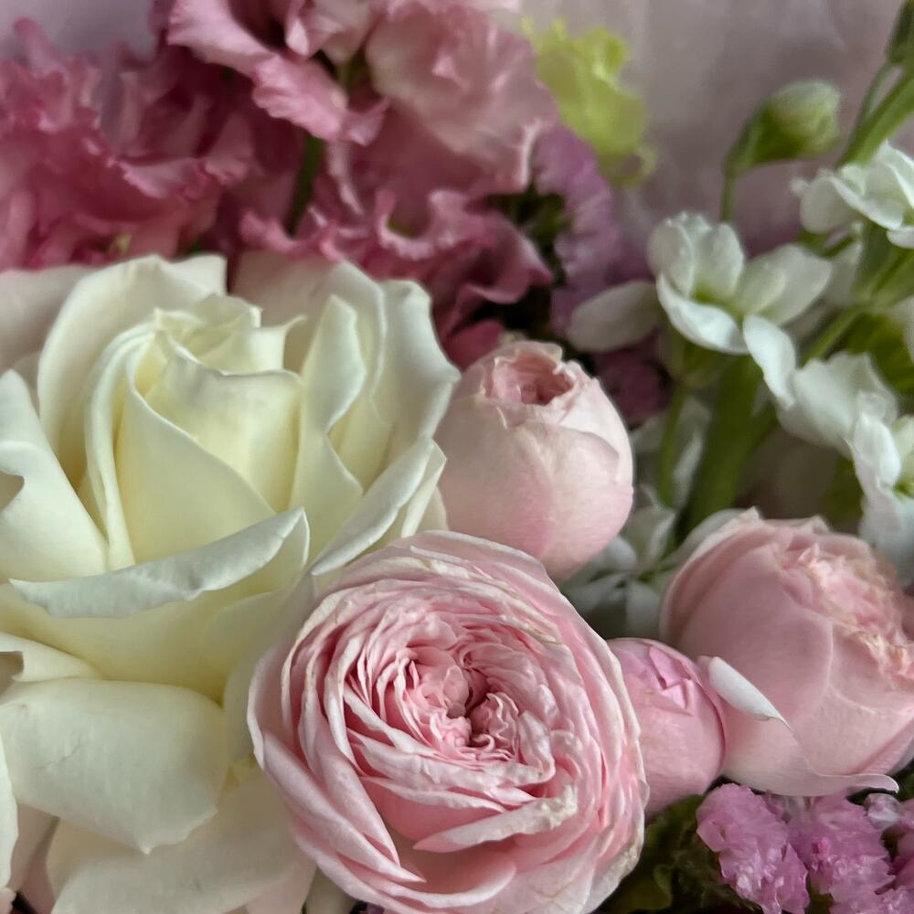 Маттиола – 1 шт.Статица – 1 шт.Атласная лента – 1 шт.Кустовая пионовидная роза – 1 шт.Одноголовая роза – 1 шт.декоративная упаковка – 1 шт.