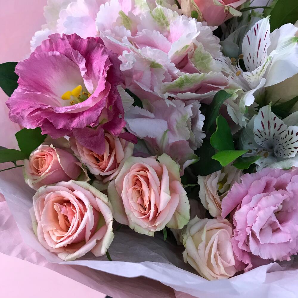 Альстромерия – 2 шт.Лизиантус – 4 шт.Оформление – 1 шт.Гортензия – 1 шт.роза кения – 2 шт.Роза кустовая – 2 шт.Рускус Италия – 3 шт.