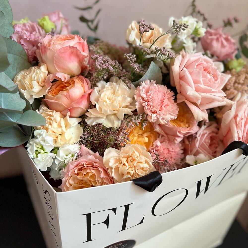 Кустовая пионовидная роза – 1 шт.Пионовидная одноголовая роза – 5 шт.садовая роза aiko – 2 шт.Диантус – 10 шт.Маттиола – 5 шт.Лизиантус (эустома) – 3 шт.Амми – 2 шт.Астильба – 3 шт.Хамелациум – 1 шт.Лимониум – 3 шт.Эвкалипт – 3 шт.Атласная лента – 2 шт.