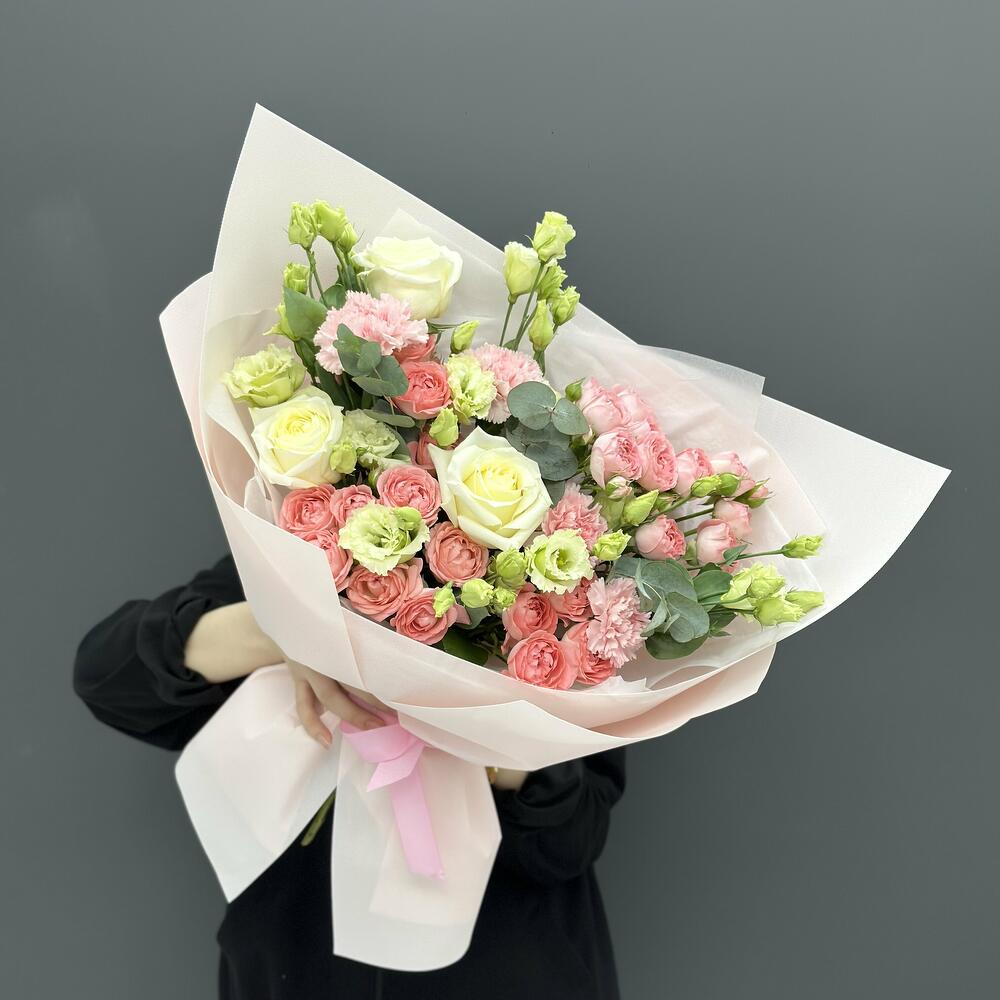 Гвоздики, Лизиантусы, Розы, Тюльпаны