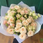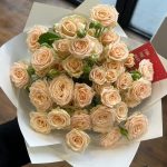 Кремовая кустовая роза – 13 шт. Открытка – 1 шт. Упаковка дизайнерская – 1 шт. инструкция по уходу за цветами – 1 шт.