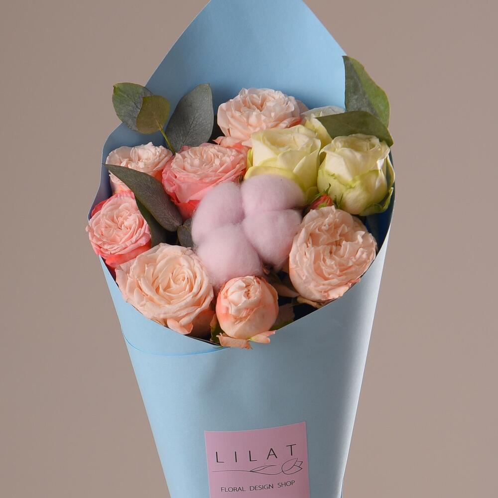 кустовые пионовидные розы – 11 шт. Оазис флористический – 1 шт. Упаковка дизайнерская – 1 шт. Открыточка с вашими пожеланиями – 1 шт.