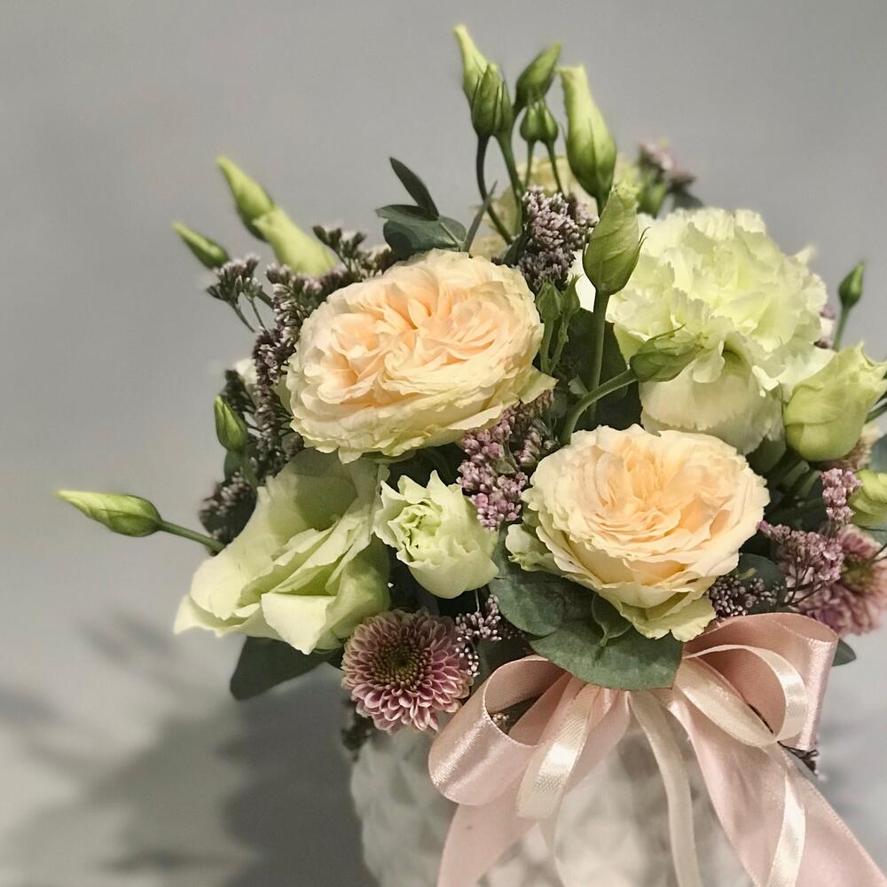 Кашпо керамическое – 1 шт.Оазис флористический – 1 шт.Роза кустовая пионовидная – 1 шт.Сантини – 1 шт.Лимониум – 1 шт.Гвоздика – 1 шт.Лизиантус – 1 шт.Эвкалипт – 1 шт.Лента – 1 шт.