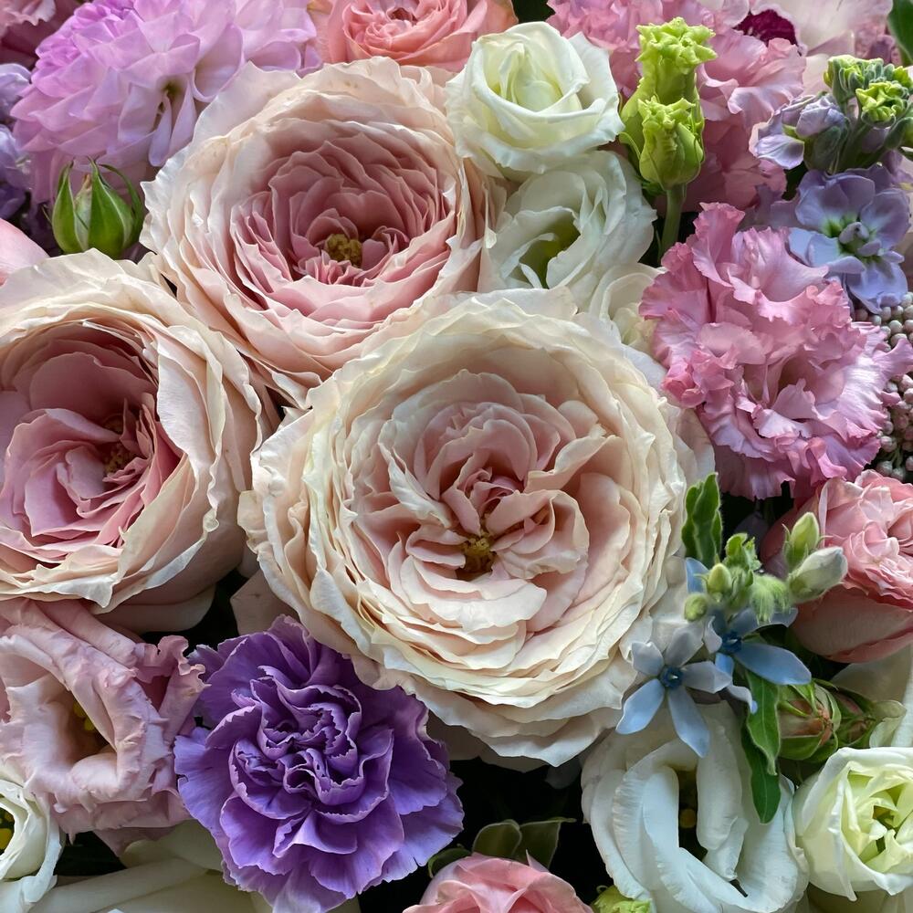 Ваксфлауэр – 3 шт.Гортензия – 2 шт.Маттиола – 5 шт.Озотамнус – 5 шт.Эвкалипт – 3 шт.Эустома – 7 шт.Лента атласная – 1 шт.гвоздика moon – 7 шт.Шляпная коробка – 1 шт.орхидея – 5 шт.Роза кустовая пионовидная – 5 шт.Оксипеталум – 11 шт.Лизиантус махровый – 5 шт.Оазис флористический – 4 шт.роза вайт о хара( ароматная) – 7 шт.роза цумуги пионовидная – 7 шт.