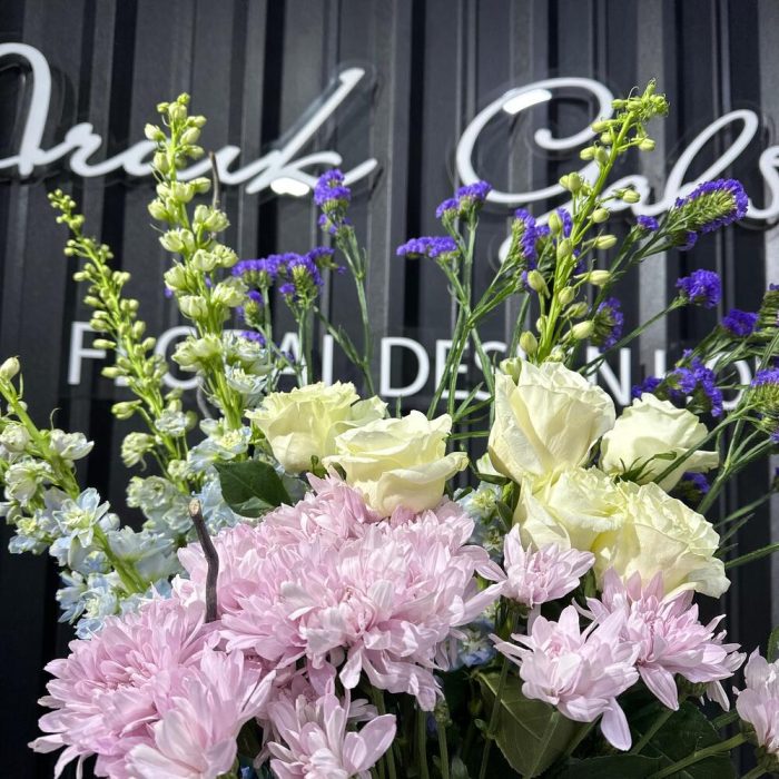Дельфиниум – 5 шт. Статица – 3 шт. Роза мондиаль 60 см – 6 шт. Хризантема кустовая – 6 шт.