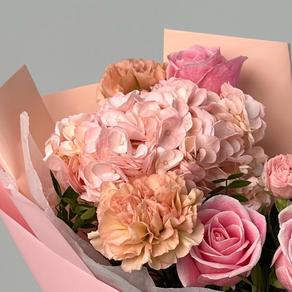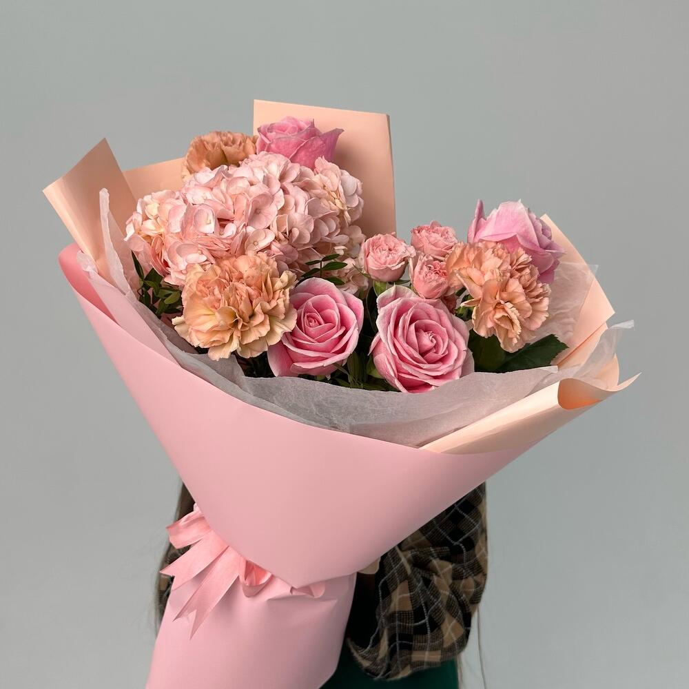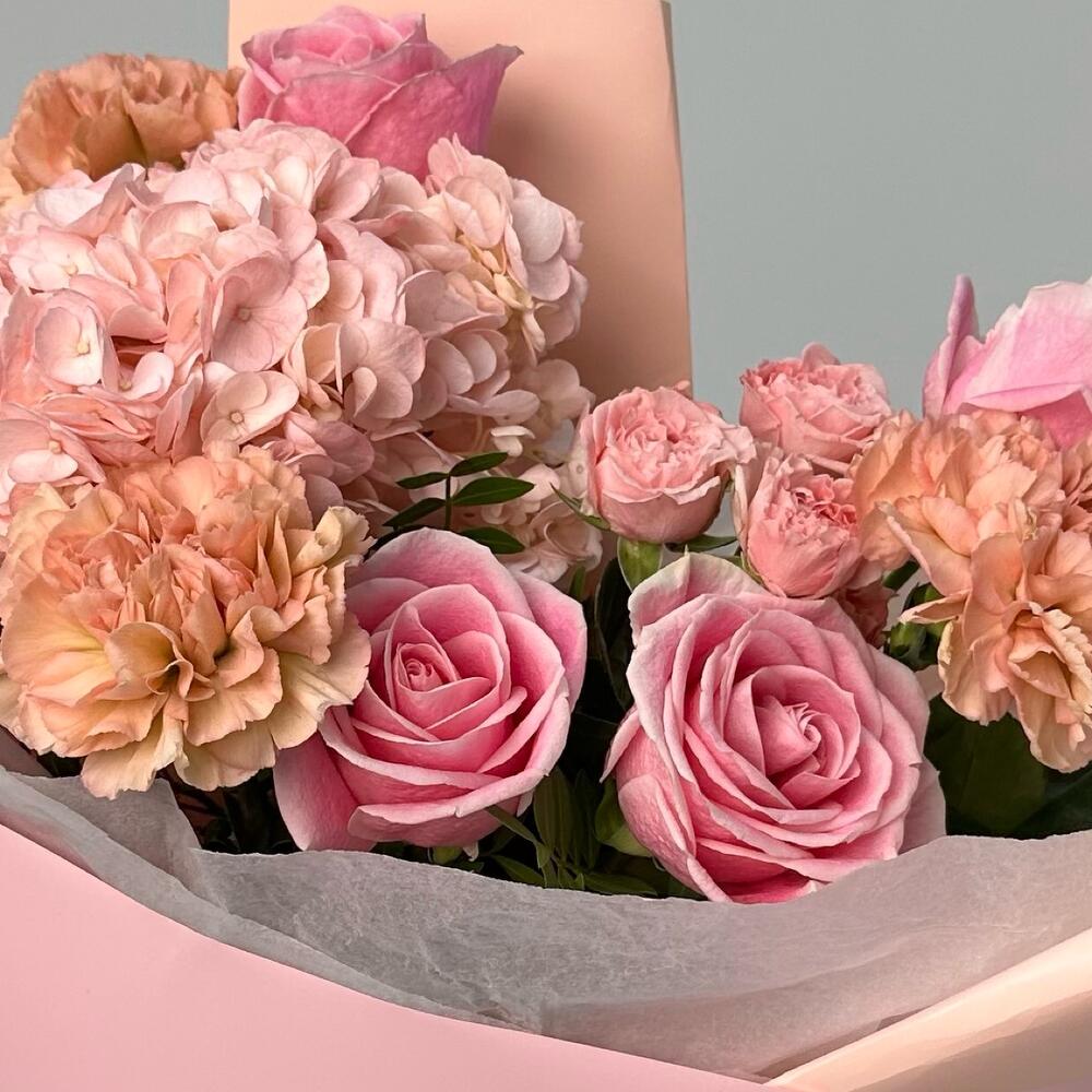 Альстромерии, Гортензии, Кустовые розы, Лизиантусы, Розы, Хризантемы