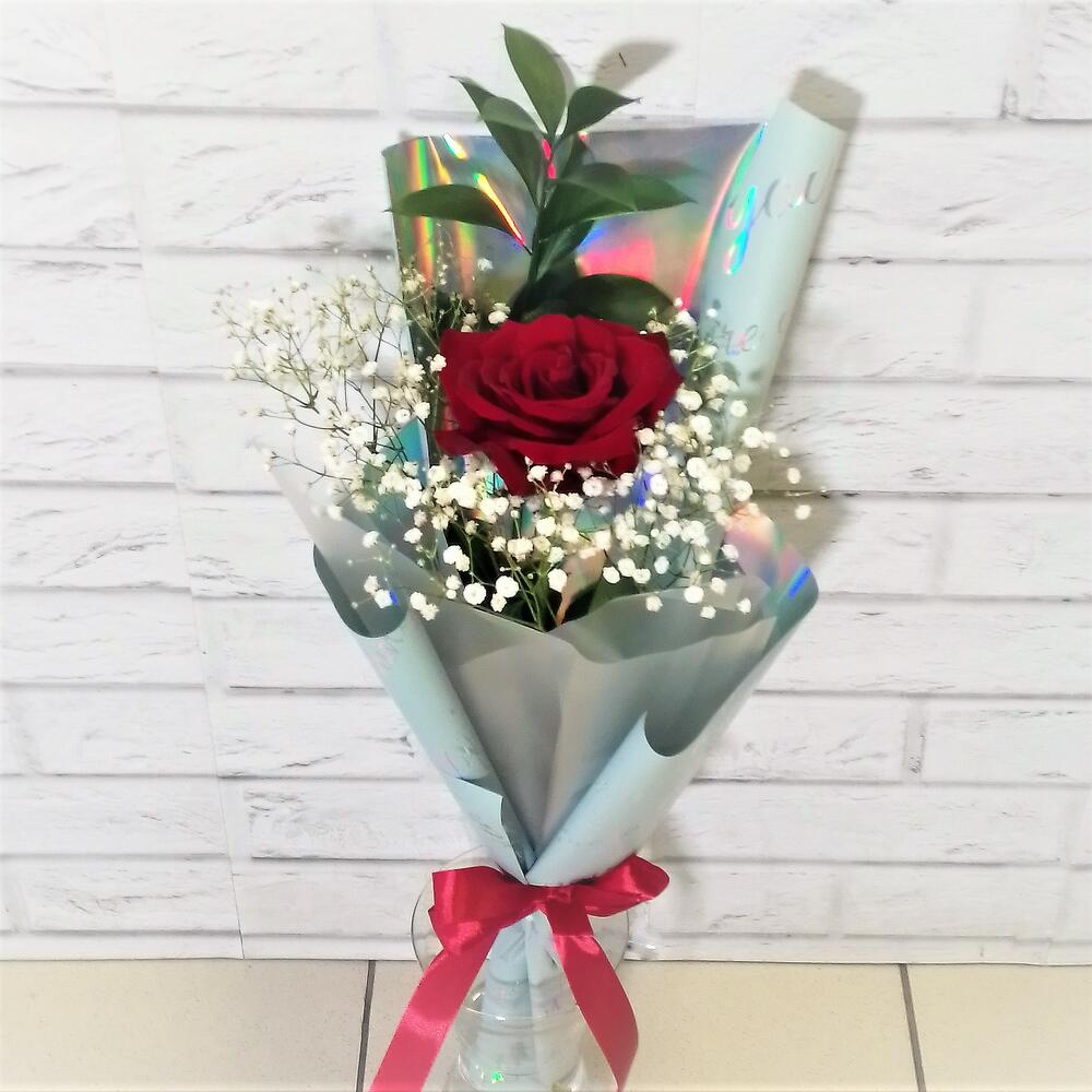 Роза – 1 шт.Гипсофила – 1 шт.Рускус Израиль – 1 шт.пленка флористическая – 2 шт.Лента атласная – 1 шт.