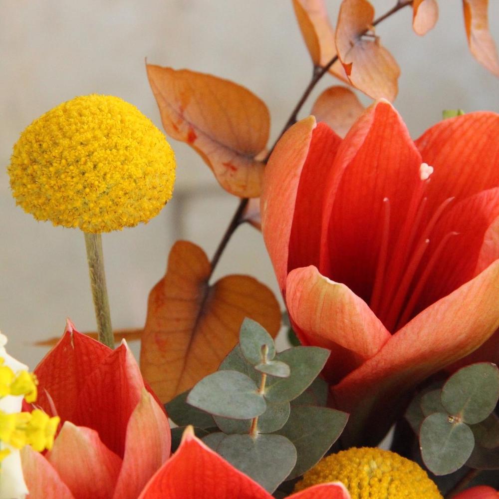 Амариллис – 2 шт.Роза пионовидная – 9 шт.Лизиантус – 9 шт.матиллла – 4 шт.Хиперикум – 2 шт.Краспедия – 2 шт.Диантус – 5 шт.Эвкалипт – 7 шт.Эвкалипт стабилизированный – 4 шт.Лента атласная – 2 шт.Лента бархат – 1 шт.