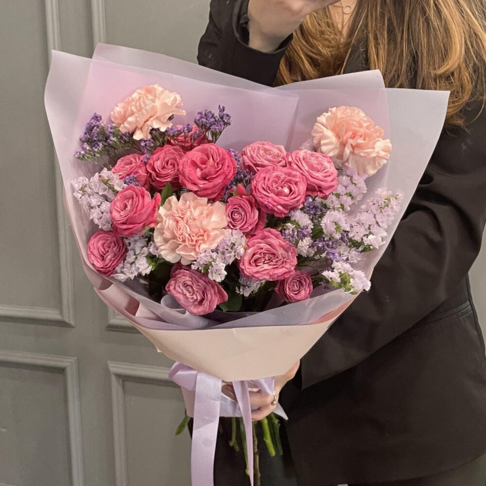Сборный букет-комплимент, составленный в лиловых оттенках из изящных роз с пионовидным раскрытием, кружевных гвоздик, фактурной статицы и лимониума – чудесный сюрприз для любого повода, готовый создать прекрасное настроение.